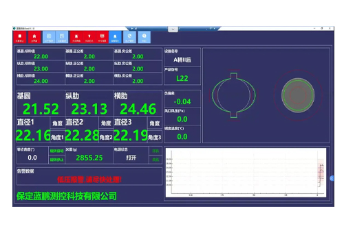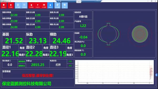 10)測量數(shù)據(jù)“超差”、測徑儀溫度“超溫”、風(fēng)機壓力過低自動報警功能。