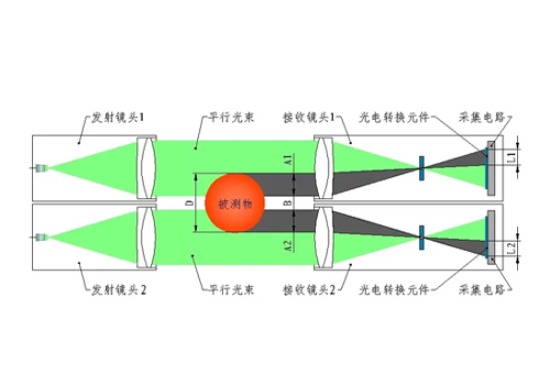 圖中2套發(fā)射鏡頭分別發(fā)射出平行光射向2套接收鏡頭,通過接收鏡頭內(nèi)的透鏡使平行光束在光電轉(zhuǎn)換元件CCD芯片上成像。當2束平行光內(nèi)放入被測物時,在光電轉(zhuǎn)換元件的像上就會出現(xiàn)陰影,設(shè)其寬度分別為L1、L2。經(jīng)過對光電轉(zhuǎn)換元件發(fā)出的電信號的處理和計算可以得出L1、L2所對應(yīng)的尺寸A1、A2,A1加A2再加上兩個鏡頭之間的凈間距B即可得出被測物的尺寸D。